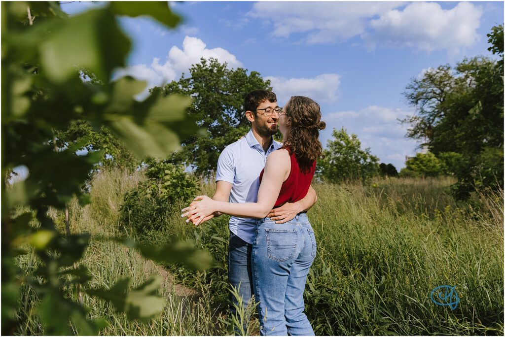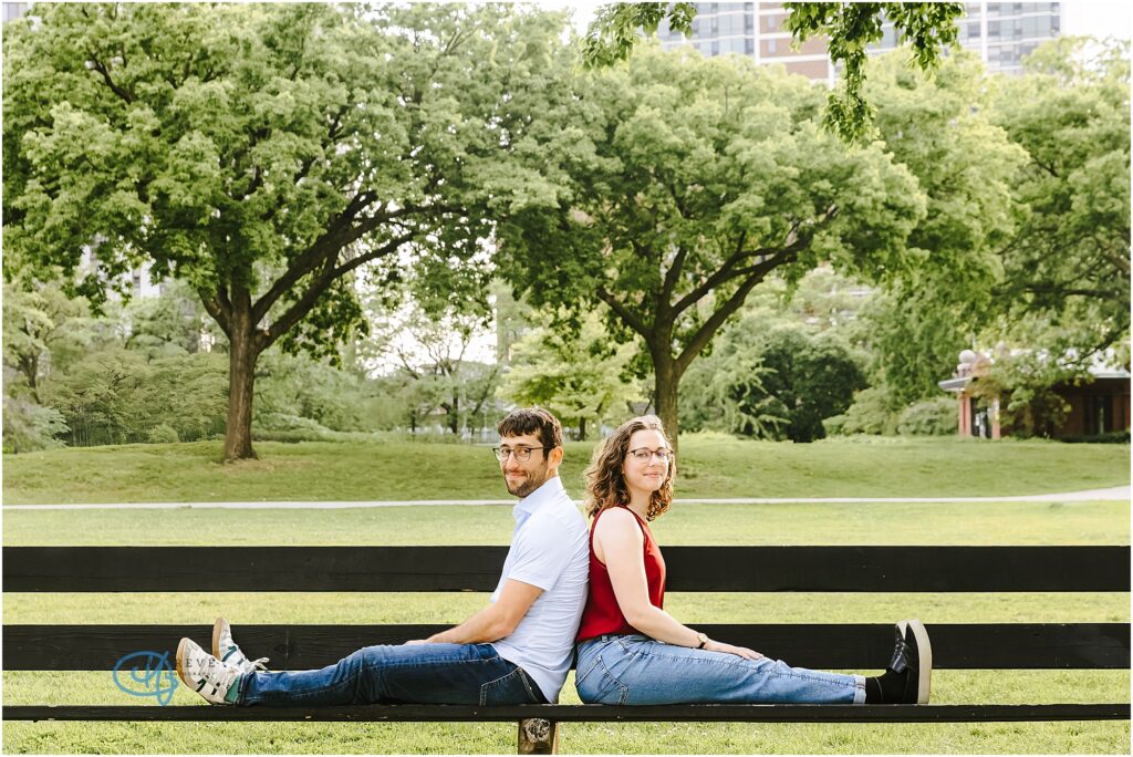 We started in Lincoln Park, where the trees were already bursting with vibrant spring color — pinks, whites, and greens all around us, creating the perfect backdrop for such a sweet couple. Julia and Luke have a way of putting each other instantly at ease. The laughs came naturally, the glances were genuine, and there was such an easy rhythm between them, which made perfect sense once I learned their story.