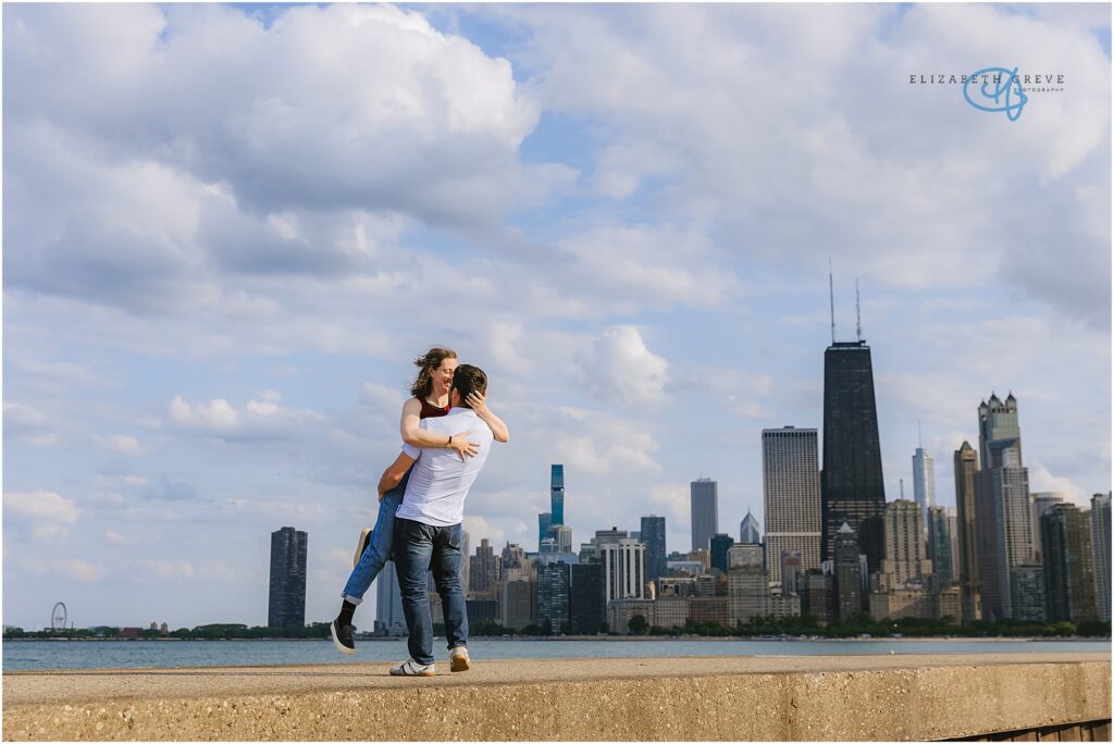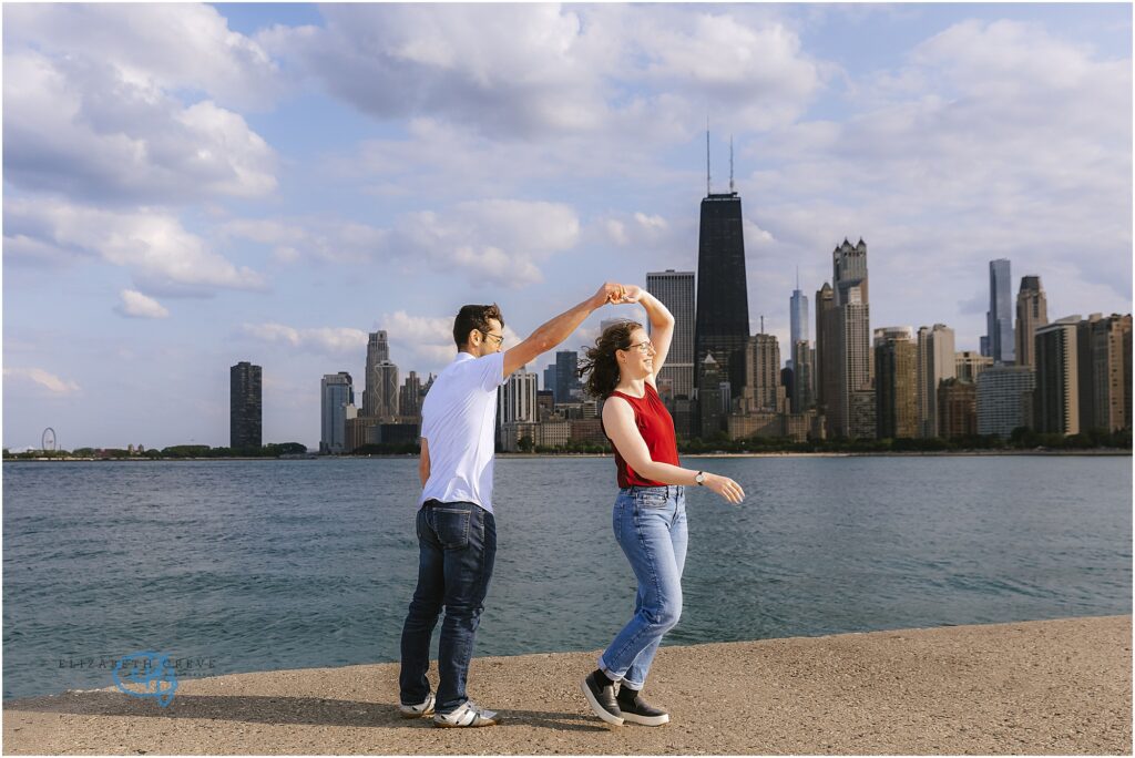After Lincoln Park, we made our way down to North Avenue Beach. The wind didn’t let up — if anything, it picked up — but Julia and Luke embraced it. They ran, danced, practiced a few unforgettable lifts, held on to each other for warmth, and looked out at the skyline together — a perfect mix of playful and intimate moments.