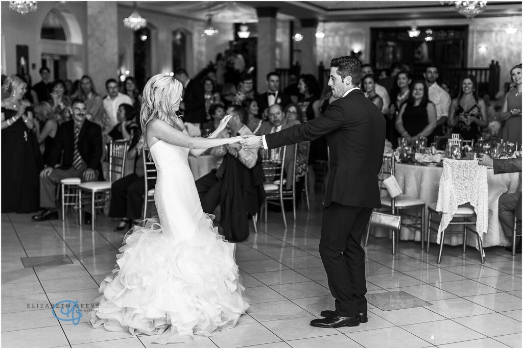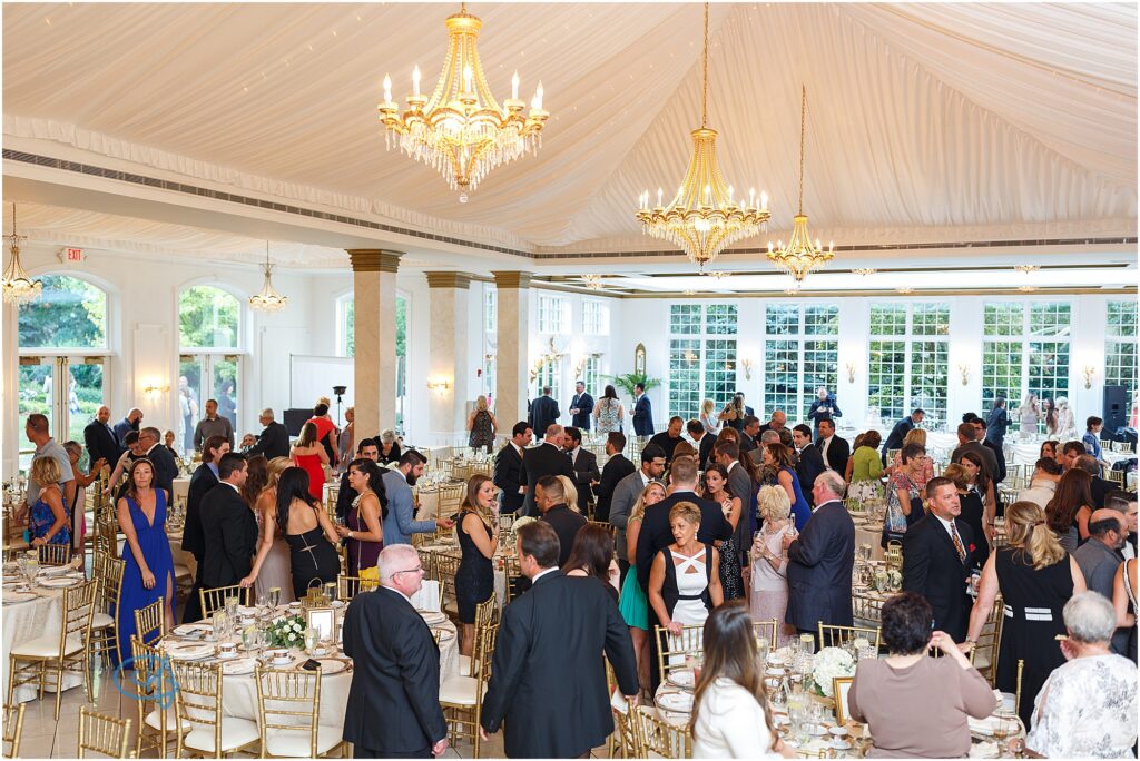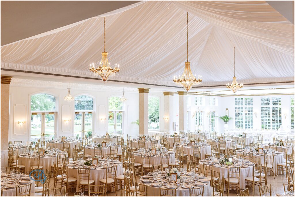 The ballroom transforms beautifully for the evening celebration. Once the lights dim and the music begins, the space comes alive with energy as guests gather to celebrate the newlyweds.