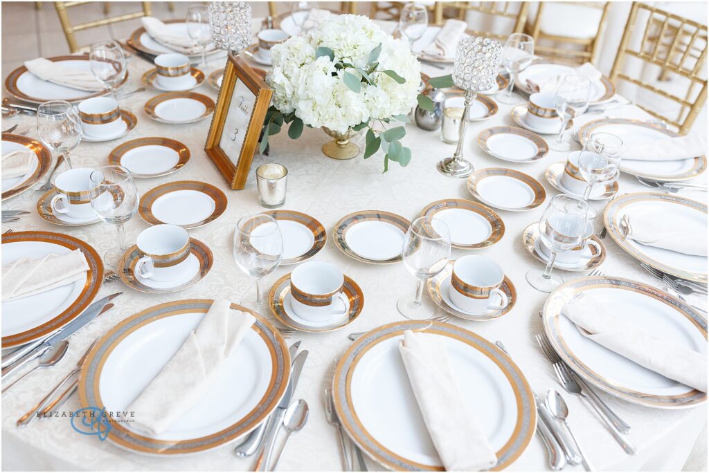 The combination of glowing candlelight and delicate blooms created a romantic ambiance that felt elevated but never overdone. Each place setting was thoughtfully arranged with classic white dinnerware, polished flatware, and crystal-clear glassware, giving the tables a refined, cohesive look.