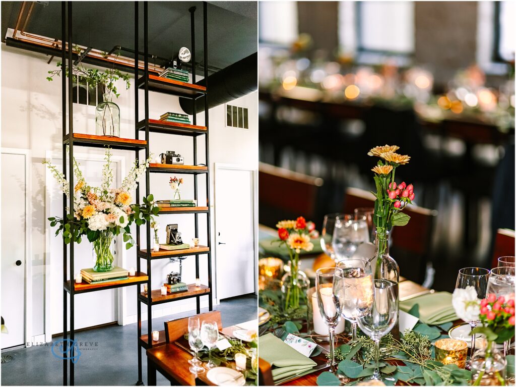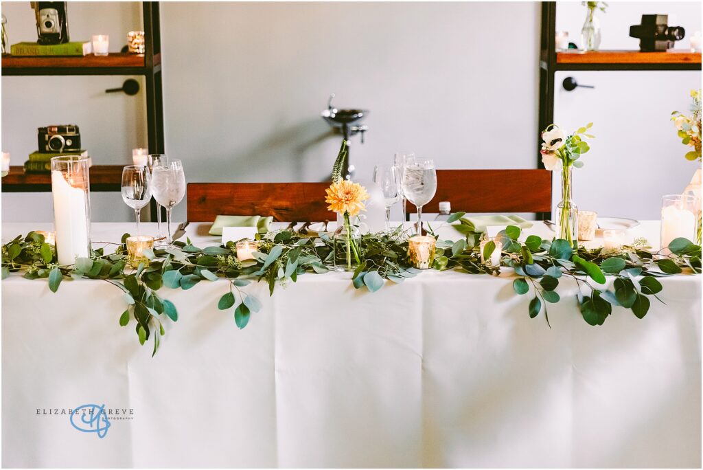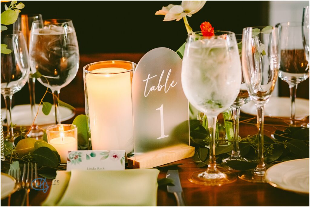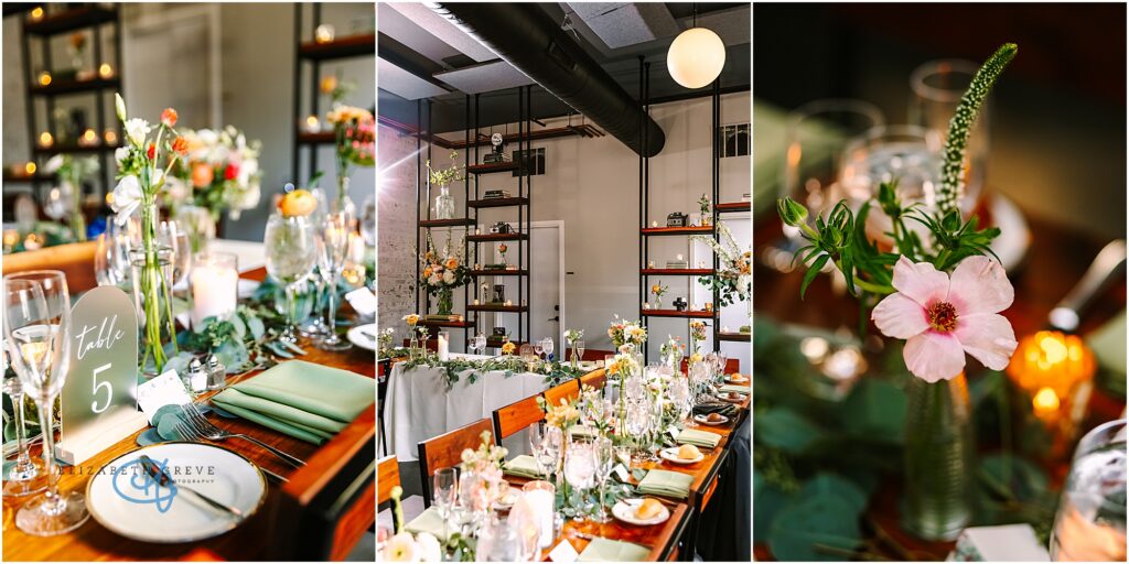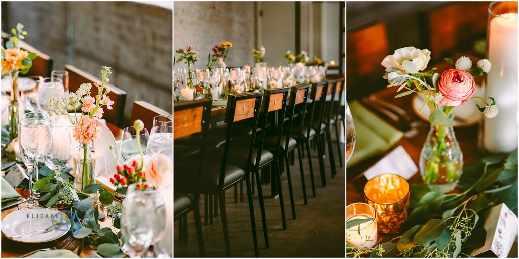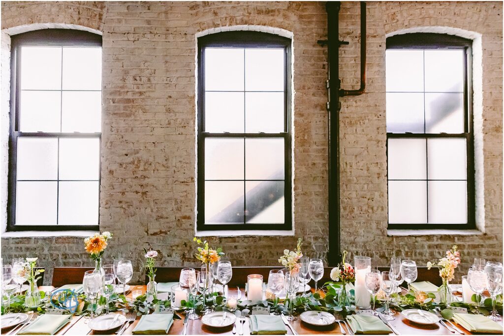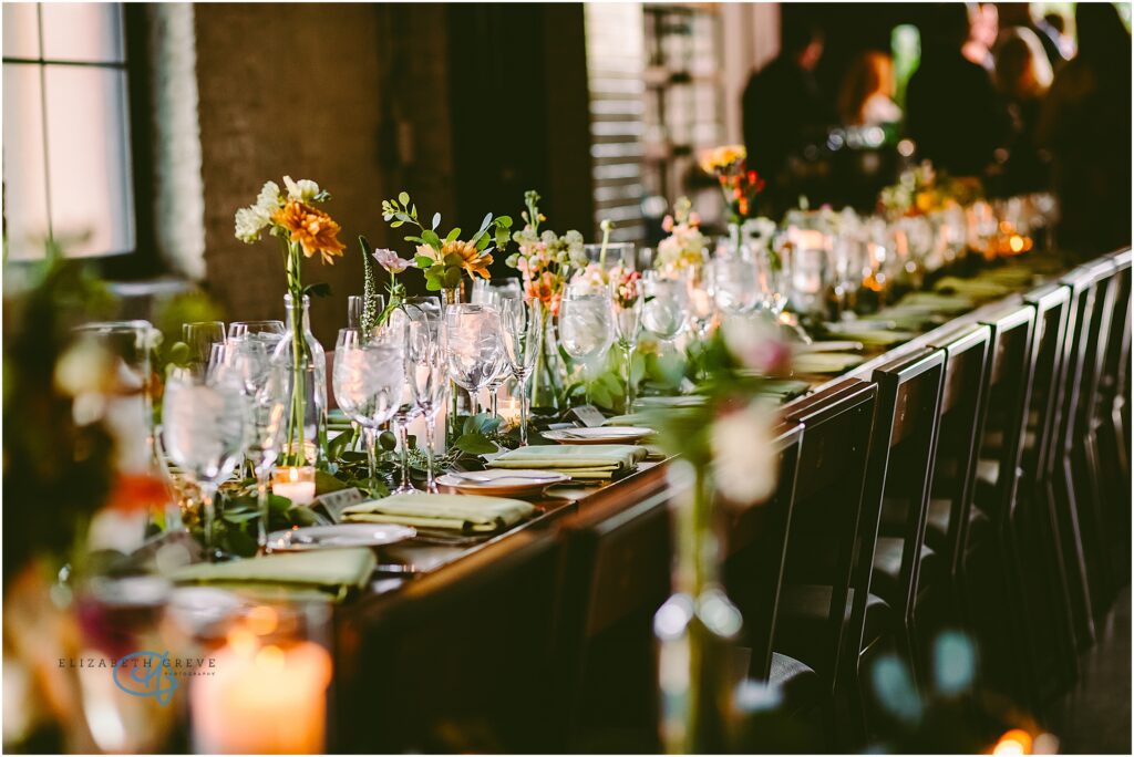 Every detail of the reception felt thoughtful and elevated without being overdone. Long banquet tables were layered with soft green linens, delicate bud vases, and a mix of fresh blooms in warm sunset tones, golden yellows, soft blush, and creamy whites. The tables glowed under candlelight, with glassware catching every flicker and adding that dreamy, intimate ambiance.