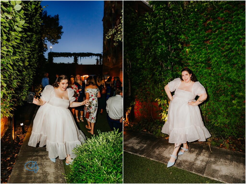 And as the evening settled in, the room transformed. Candles burned lower, the music turned up, and the energy shifted from elegant dinner party to epic celebration. Later in the evening, Valentine disappeared for a moment and came back in a second look that was made for dancing. Lighter, effortless, and full of movement, the perfect party dress for a bride who had no intention of slowing down.